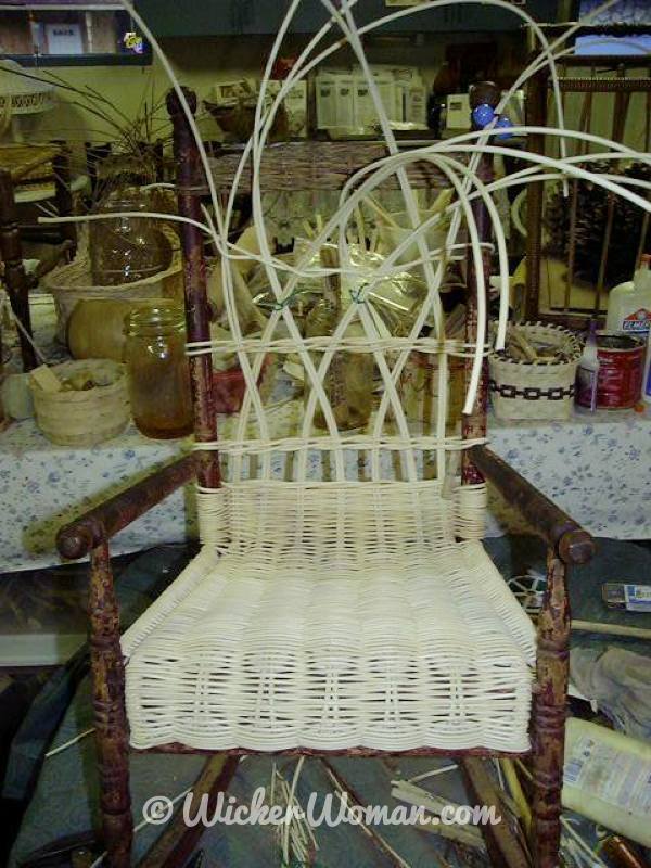 Step #4. Here’s the cute little child’s wicker rocker all finished. The rolled and arched wicker back headrest area and fitched “X” design on the back are all done in this photo.